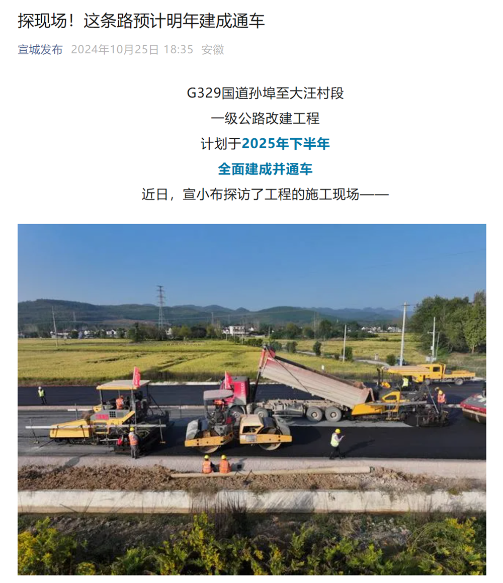 10月25日,《宣城發(fā)布》對G329改建工程項目建設情況進行了報道。