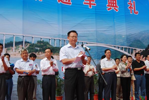 10時(shí)28分典禮正式舉行,來(lái)自兩岸的數(shù)千名群眾見(jiàn)證了這一激動(dòng)人心的時(shí)刻。省交通運(yùn)輸廳廳長(zhǎng)梅勁、省公路局局長(zhǎng)秦勤、省公路學(xué)會(huì)理事長(zhǎng)李永鐸、六安市副市長(zhǎng)楊光祥、金寨縣委書(shū)記沙洪虎、縣長(zhǎng)夏倫平和四大班子成員、金寨縣各個(gè)鄉(xiāng)鎮(zhèn)主要負(fù)責(zé)人等領(lǐng)導(dǎo)出席了通車(chē)典禮。典禮由金寨縣委副書(shū)記、縣長(zhǎng)夏倫平主持。來(lái)自我公司代表、金寨縣各單位代表共同組織了八個(gè)方陣參加了典禮。公司總經(jīng)理汪衛(wèi)東應(yīng)邀出席典禮,并參加了剪彩儀式。