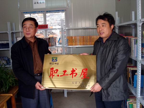 劉主席首先來到項目部職工書屋,察看了書屋的軟硬件設施及借閱情況,并聽取了項目經(jīng)理江仲明關于項目施工及職工書屋創(chuàng)建情況的匯報。劉主席對書屋的建設和管理予以了肯定和贊許,并對書屋更好的發(fā)展提出了希望和要求:一、立足實際、講求實效;二、營造氛圍,大力宣傳;三、實現(xiàn)資源共享,發(fā)揮最大效益;四、總結(jié)經(jīng)驗、持續(xù)發(fā)展。邢應梅書記還饒有興趣地翻看了圖書借閱登記表,了解職工借閱圖書情況,并對進一步完善職工書屋的建設提出了幾點建議。隨后舉行了簡短的授牌儀式,劉主席向項目經(jīng)理江仲明轉(zhuǎn)授了由安徽省總工會頒發(fā)的“職工書屋”牌匾,并代表集團工會向職工書屋贈送了各類書籍300余冊。