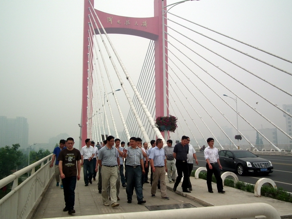 觀摩團一行首先來到淠史杭大橋前駐足參觀。在隨后召開座談會上,石懷遠代表公司就該工程的實施、技術要點、質量安全管理、工程進度等情況向與會人員作了簡要匯報。公司副總工程師陳莘對該橋的工藝和施工要點作了講解。重點局項目管理二處鄭浩處長指出,安徽路橋在斜拉橋施工上有著有目共睹的成績,希望能結合以前的施工案例,總結經驗,以爭取更大的發(fā)展空間。