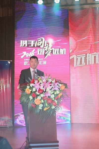 演出現(xiàn)場華燈璀璨,座無虛席,氣氛喜慶熱烈。匯演正式開始前,公司董事長、總經(jīng)理孫學(xué)軍發(fā)表了熱情洋溢的致辭。他首先代表公司向蒞臨現(xiàn)場的嘉賓及長期以來堅(jiān)持在公司各個(gè)崗位的員工及家屬,致以誠摯的問候和新春的美好祝愿,向默默奉獻(xiàn),為路橋事業(yè)奠基的前輩們致以崇高的敬意。指出,2015年,是宏觀形勢錯(cuò)綜復(fù)雜的一年,也是公司成績斐然的一年,在建工集團(tuán)的正確領(lǐng)導(dǎo)下,全體員工凝心聚力,開拓奮進(jìn),取得了驕人的業(yè)績。充滿機(jī)遇和挑戰(zhàn)的“十三五”已經(jīng)開局,全體路橋人要秉承優(yōu)良傳統(tǒng),凝心聚力,同舟共濟(jì),譜寫安徽路橋新的輝煌。