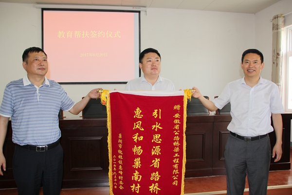 6月20日下午,在巢湖市槐林鎮(zhèn)惠峰村活動中心,槐林鎮(zhèn)黨委主要負(fù)責(zé)人將一面錦旗贈予安徽省公路橋梁工程有限公司,以感謝公司為當(dāng)?shù)胤鲐毠ぷ髯鞒龅呐拓暙I(xiàn)。公司黨委委員、副總經(jīng)理任杰代表公司接受了錦旗。