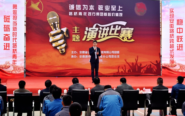 公司黨委書(shū)記、董事長(zhǎng)、總經(jīng)理孫學(xué)軍致開(kāi)幕辭,他代表公司對(duì)蒞臨現(xiàn)場(chǎng)的嘉賓表示熱烈歡迎,向參賽選手及一線(xiàn)青年員工致以美好祝愿。孫總指出:“誠(chéng)信為本 敬業(yè)至上”是集團(tuán)公司企業(yè)文化的精髓和靈魂,廣大團(tuán)員青年要深刻領(lǐng)會(huì)集團(tuán)核心價(jià)值觀的精神實(shí)質(zhì),傳承路橋文化特色,立足工作實(shí)際,內(nèi)化于心,外化于行,充分展現(xiàn)新時(shí)代路橋人的精神面貌。孫總要求,全體路橋青年要深入學(xué)習(xí)貫徹黨的十九大精神,始終堅(jiān)持誠(chéng)信為本、敬業(yè)至上,用實(shí)際行動(dòng)為奮力開(kāi)創(chuàng)安徽路橋轉(zhuǎn)型發(fā)展新局面貢獻(xiàn)力量。