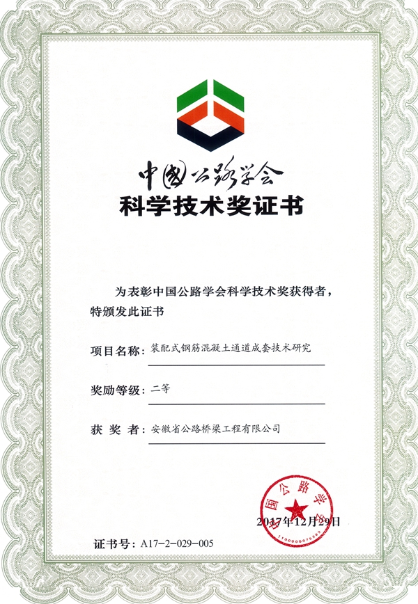 近期,“2017年度中國(guó)公路學(xué)會(huì)科學(xué)技術(shù)獎(jiǎng)?lì)C獎(jiǎng)大會(huì)”在北京召開,公司選送的《裝配式鋼筋混凝土通道成套技術(shù)研究》成果榮獲二等獎(jiǎng)。