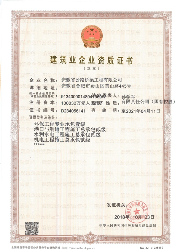 10月23日,公司環(huán)保工程專業(yè)承包壹級、水利水電工程施工總承包貳級、機電工程施工總承包貳級三項資質(zhì)順利通過安徽省住房和城鄉(xiāng)建設廳審查核準。三項新資質(zhì)的取得為公司進一步拓展非公路施工業(yè)務,實現(xiàn)經(jīng)營業(yè)務多領域發(fā)展打下了基礎。