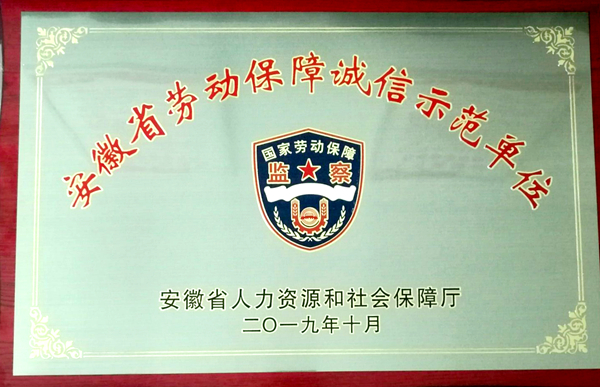 11月6日,安徽省人力資源和社會保障廳舉行2019年安徽省勞動保障誠信示范單位授牌儀式,經(jīng)過綜合評審和社會公示等選拔程序,公司榮獲“2019年安徽省勞動保障誠信示范單位”稱號。