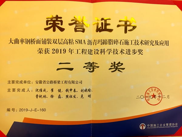 近日,2019年中國(guó)施工企業(yè)管理協(xié)會(huì)工程建設(shè)科學(xué)技術(shù)獎(jiǎng)勵(lì)大會(huì)在天津召開(kāi),公司主持的課題成果“大曲率鋼橋面鋪裝雙層高粘SMA瀝青瑪蹄脂碎石施工技術(shù)”經(jīng)過(guò)專家評(píng)審,榮獲二等獎(jiǎng)。