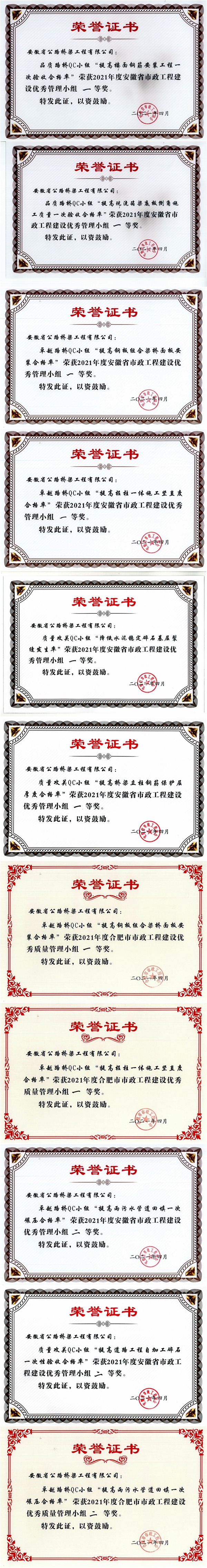 2021年度市政工程建設(shè)優(yōu)秀QC小組活動(dòng)成果共申報(bào)15項(xiàng),獲得安徽省市政工程優(yōu)秀QC小組一等獎(jiǎng)9項(xiàng)、二等獎(jiǎng)6項(xiàng),獲得合肥市市政工程優(yōu)秀QC小組一等獎(jiǎng)9項(xiàng)、二等獎(jiǎng)6項(xiàng);同時(shí)公司榮獲“安徽省市政工程QC優(yōu)秀企業(yè)”和“合肥市政工程QC優(yōu)秀企業(yè)”。